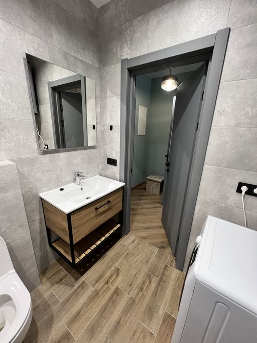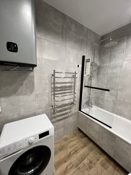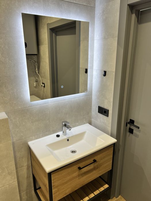 Санвузол з ванною і тропічним душем, з датчиком від затоплення, пральна машина також з датчиком від затоплення, бойлер, умивальник з нішою для зберігання, зеркало з підсвіткою, унітаз з інсталяцією, рушникосушарка.