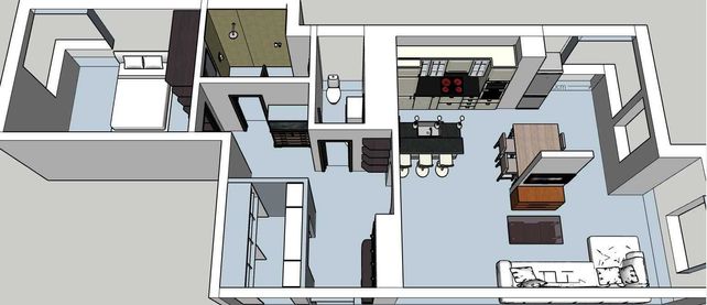 - велика кухня-вітальня з зонуванням: зона приготування їжі, зона прийому їжі та зона відпочинку, частина якої є мобільною кімнатою;