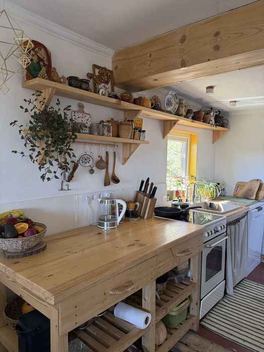 • Кухня студія з усією необхідною технікою: електроплита, духовка, мікрохвильова, холодильник, посудомийка, соковитискач, блендер, фільтри для води. Розкладний диван і робоча піч, де можна готувати їжу.