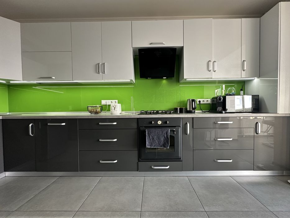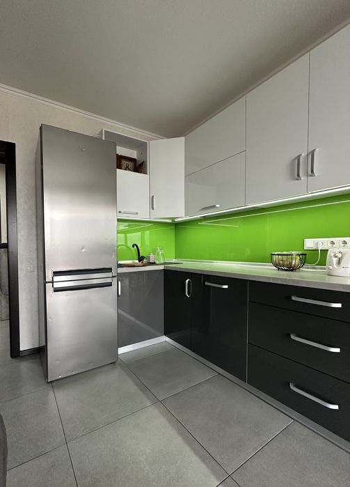 Продається з меблями та технікою: посудомийна машина, духова шафа, холодильник, пральна машина, мікрохвильова піч, обідній стіл, 3 стільця.
