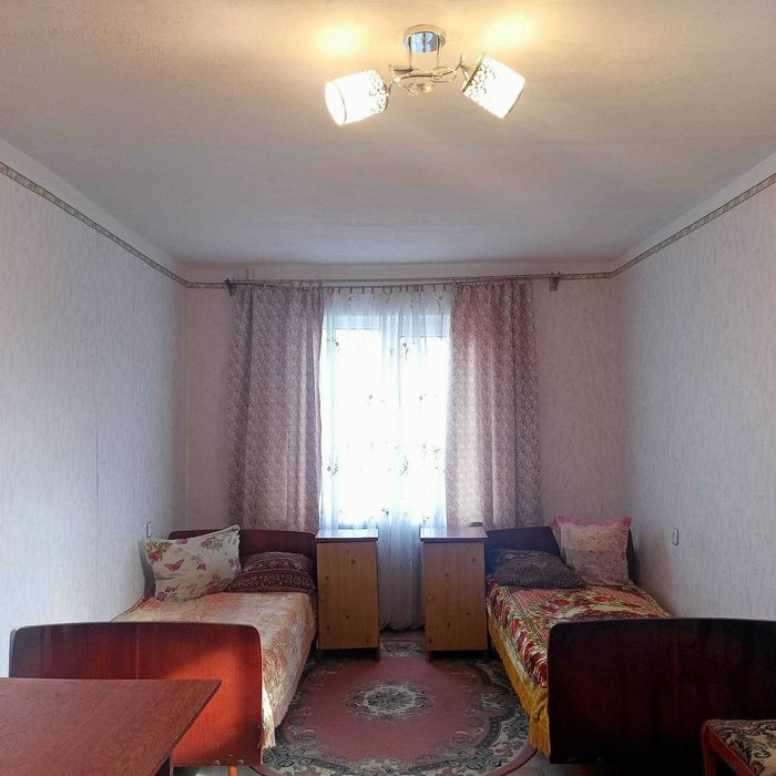 Загальна площа 65 м2, велика прохідна кімната 18 м2 з балконом, дві окремі кімнати по 15 м2, кухня з меблями, ванна кімната. Квартира з меблями (5 ліжок, прикроватні тумбочки, шафа, стільці, робочий стіл, журнальний стіл, інші меблі), холодильник, електроплита, пральна машинка, бойлер, металопластикові вікна.