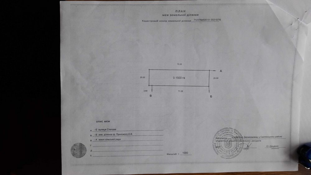 Терміново продам земельну ділянку 0,15га р-н РПЗ; Продам земельну ділянку для будівництва та обслуговування житлових будівель та споруд (присадибна ділянка) площею 0,1500га,розміром 20м х 75м, кадастровий номер -7123784500:01:002:0276, яка розташована в Смілянському районі селище Холоднянське вулиця Степова 2 Б, район РПЗ новобудови, біля зупинки Південна, магазин Санта -Марія, Хепі - Ленд. Під'їзд асфальтний. Світло, газ, вода, біля ділянки - 50 метрів по вулиці. В радіусі 500 метрів - АЗС, магазин, аптека, школа, дитячий садочок, ставок. Господарські будівлі на ділянці та огорожа відсутні. Ціна 157000,00грн. торг.
