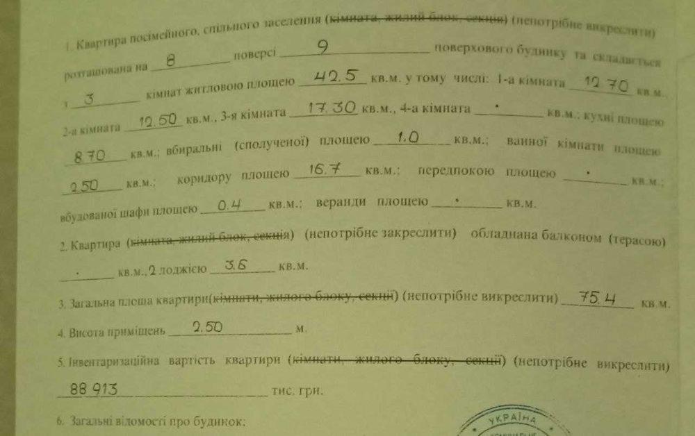 Не кутова. Житлова площа 42,5 кв. м. Загальна площа 75,4 кв. м.