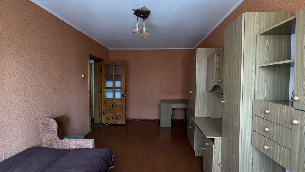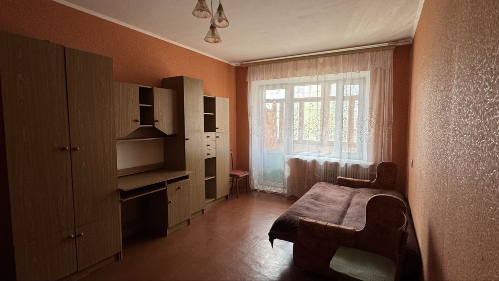 В кімнаті два розкладних дивани , шафа стінка та шафа в прихожій. Кімната з великим заскленим балконом .