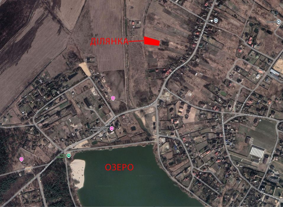 Ділянка, Бобриця 15 соток. Під будівництво, біля озера; Продається приватна земельна ділянка 15 соток у селі Бобриця (Київська область), призначення — під будівництво житлового будинку. Кадастровий номер 3222480601:01:012:5003