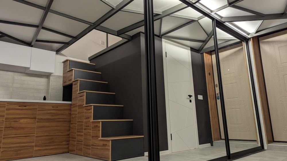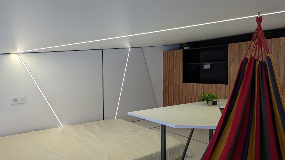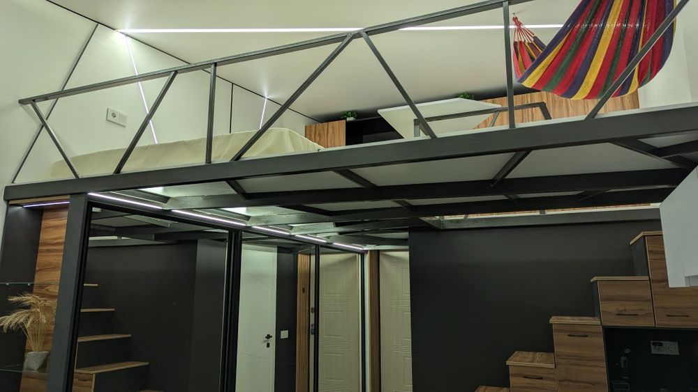 Архітектор зумів максимально ефективно використати індивідуальні особливості приміщення і тепер на Вас працює не тільки квадратура, а і кубатури! Більше того, на другий рівень- 16кв.м. квартплата не нараховується, бо квартира по документах 22 кВ.м. а все решта, талант і майстерність архітектора. А між тим, другий рівень виконує ряд важливих потреб для життя: спальна зона(велике двоспальне місце), робоча зона( два письмових стола), ТV зона та місце зберігання( чотириметрова глибока шафа), лаунж зона( місце для гамаку, йоги, відпочинку компанії за кальяном, іграми чи чайної церемонії)