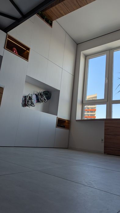 Дизайн квартири виконаний у симбіозі стилів Мінімалізму та Лофта. Розрахован кожен сантиметр простору! Квартира, при своєї відносно невеличкій площі, виконує функцію двокімнатної квартири, з усіма необхідними умовами для комфортного проживання не тільки активної пари, а і невеличкої сім'ї. Кожен квадратний метр задіяний і працює на Вас! Скрізь у великій кількості розташовані місця зберігання речей, як що їх скласти до купи, ніяка гардероба з цим об'ємом не впорається!