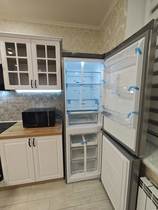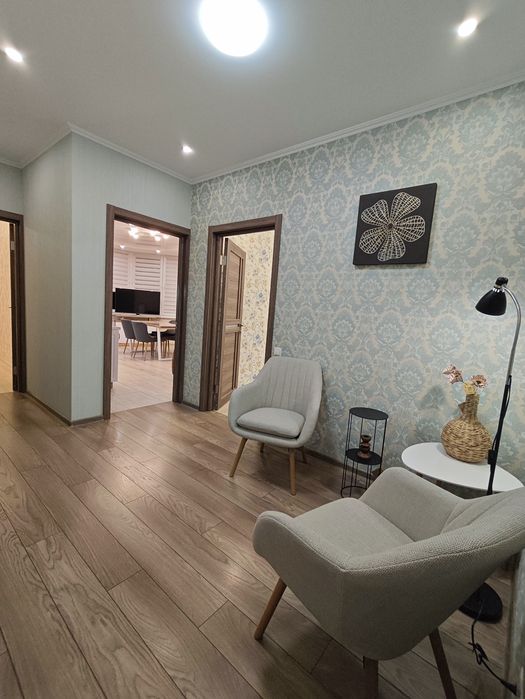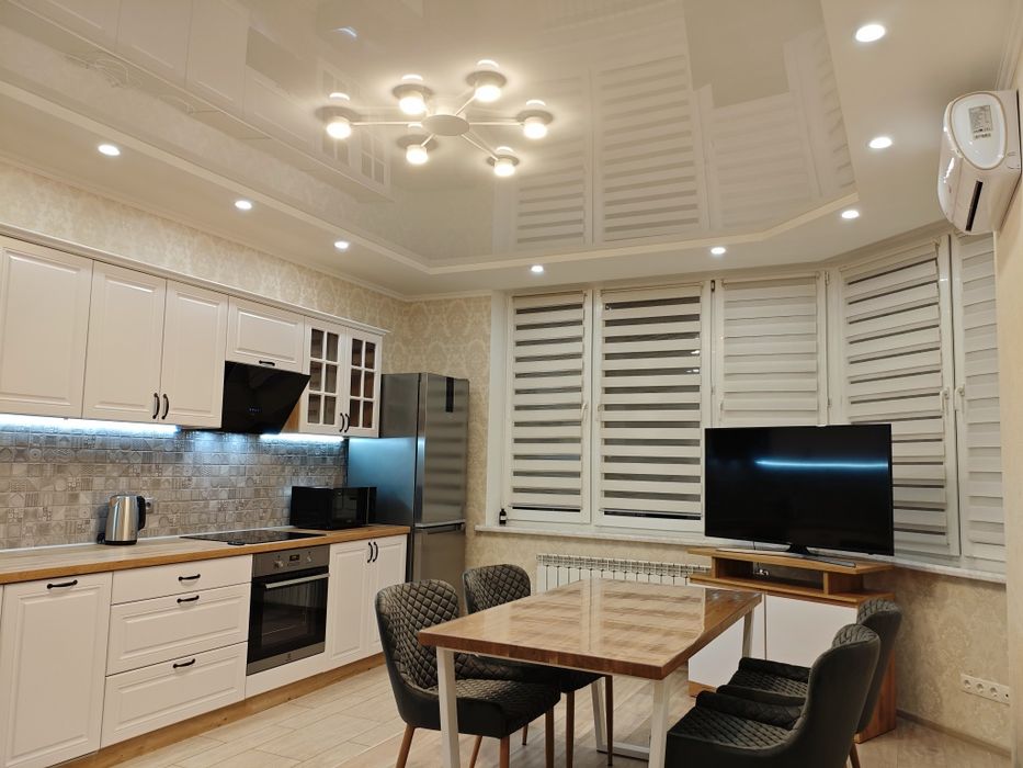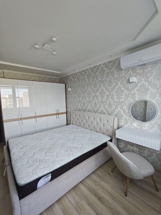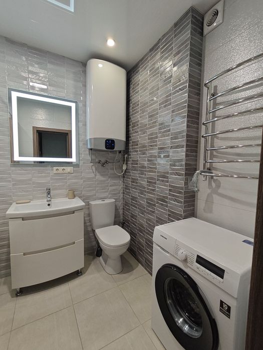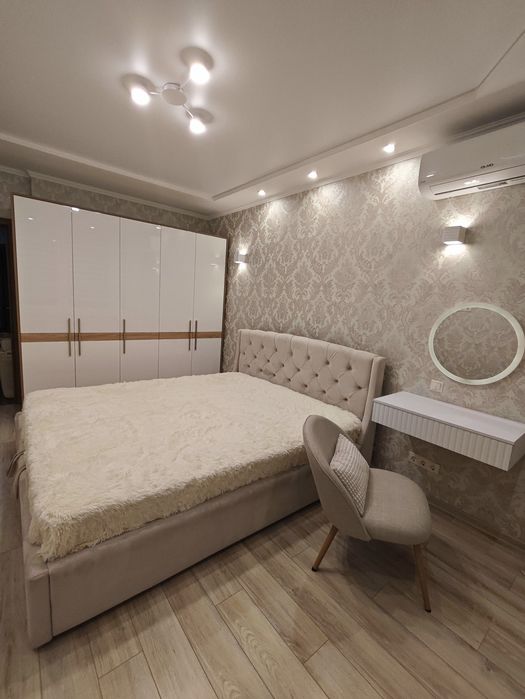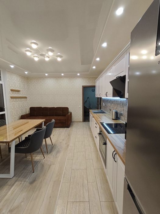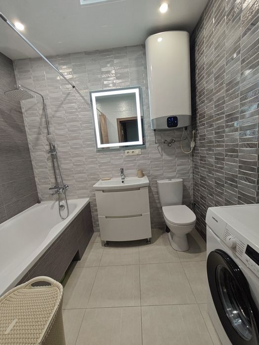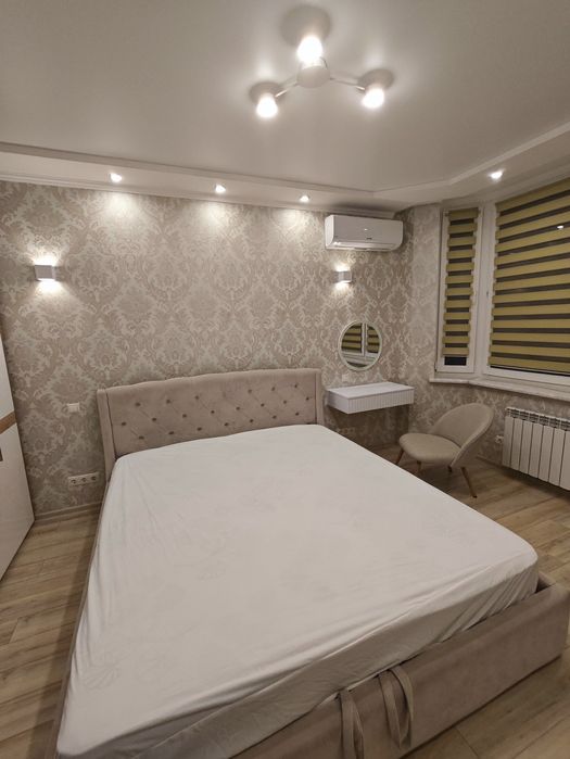 Квартира обладнана наступним: варильна поверхня, духова шафа, холодильник, посудомийна та пральна машини, мікрохвильова піч, витяжка, чайник, пилосос, праска, бойлер. В кожній кімнаті встановлені кондиціонери. Меблі та техніка нові, це перша здача!