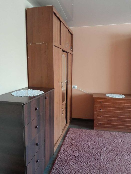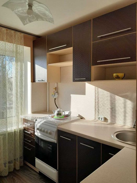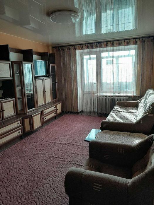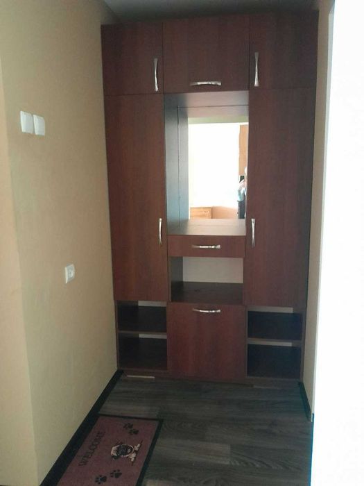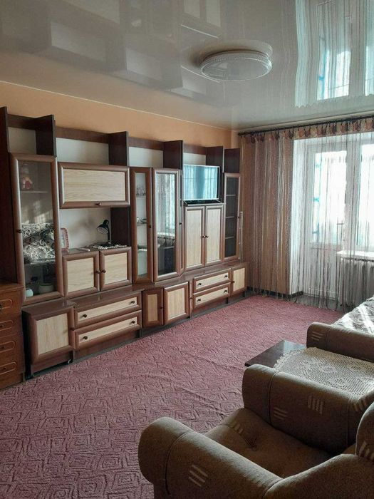 Серед меблювання: нова кухня, плита, бойлер, встроєний новий і великий шкаф-гардероб із зеркалом. У кімнаті: стінка та тумба.