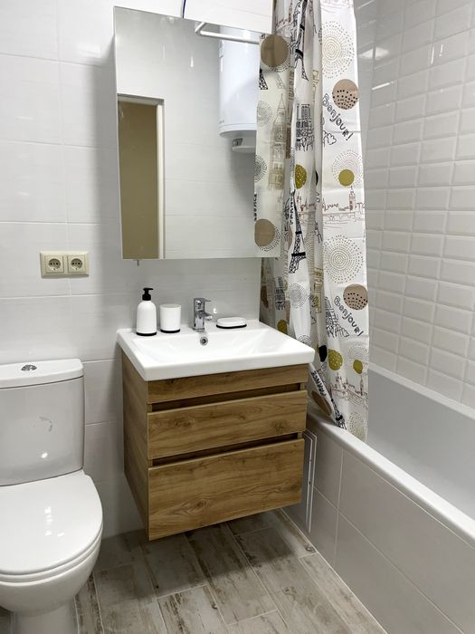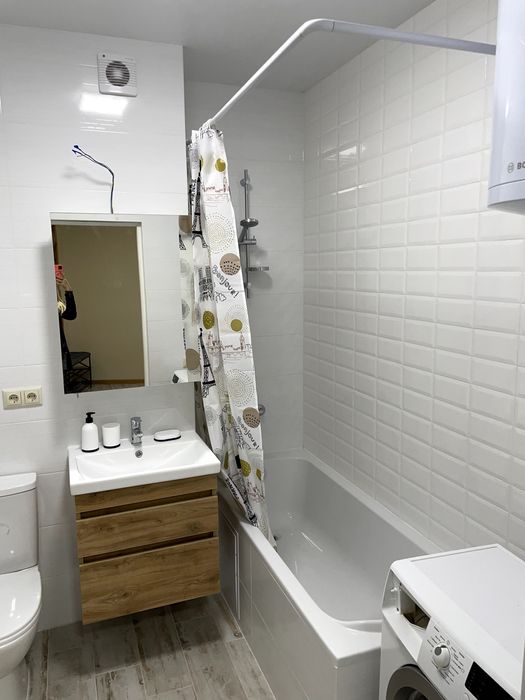 Велика простора кухня-вітальня. Холодильник, духова шафа, витяжка, електропіч, чайник. Розміщений гарний зручний диван(розкладний). У спальні комфортне ліжко, тумбочки, комод, кондиціонер і велика шафа. У ванній є пралка та встановлений бойлер.