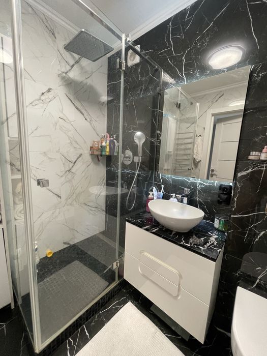 Підвісна тумба, дві шухляди з системою touch зі стільницею з натурального мармуру та стильною раковиною. Змішувач geberit. Дзеркало з підсвіткою. Тепла підлога.