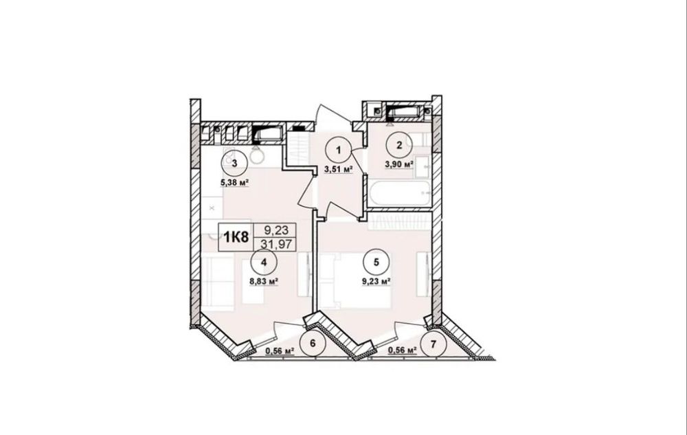 Загальна площа 32 м² · житлова 27.34 м² · кухня 5.38 м²