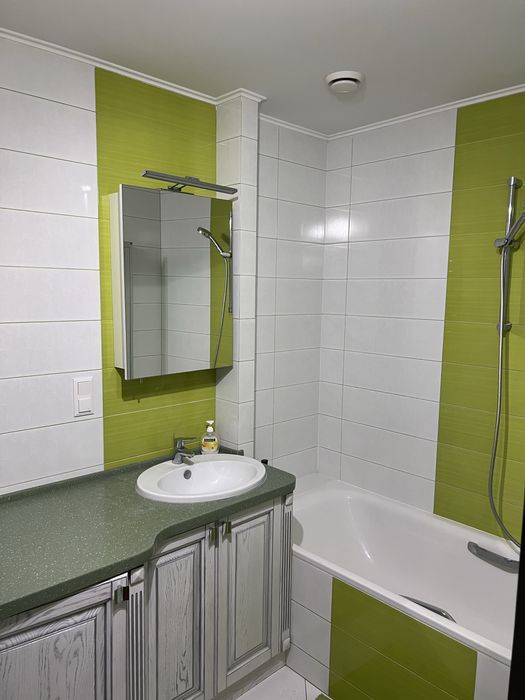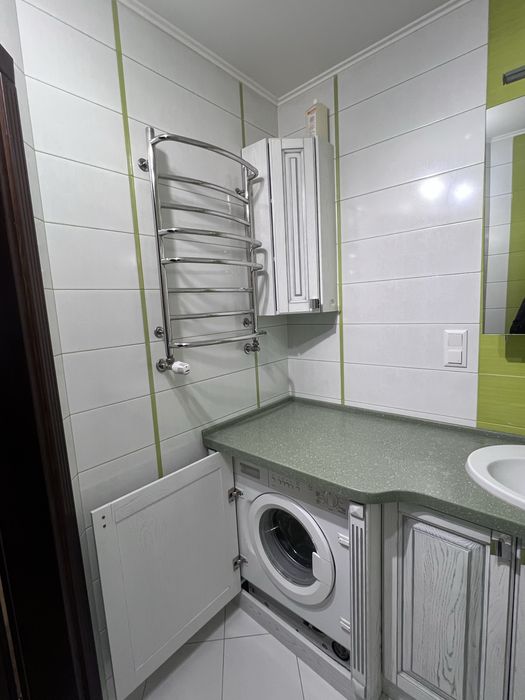 * Ванна – виготовлені під замовлення із ясена шафи під умивальник та вмонтована пральна машинка BOSCH.