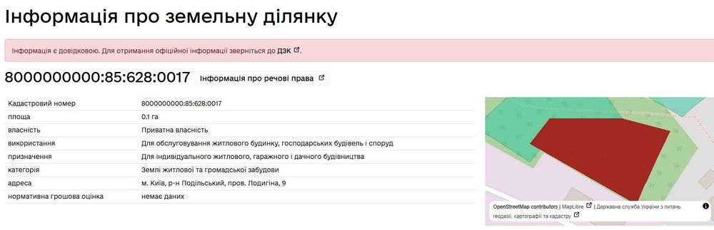 Подільський; Продаж ділянки 0,1 га у Подільському районі міста Києва; Продаж земельної ділянки площею 10 соток (0,1 а) у пров. Лодигіна, 9 (зараз пров. Дендрологічний) у Подільському районі м. Києва. Цільове призначення: для будівництва індивідуального житлового будинку. Наявні всі комунікації. Вільна від забудови. Є можливість купити прилеглу ділянку площею 0.1 га за 50 тис. у.о. (разом буде 0,2 га під забудову, кадастрові номери 8000000000:85:628:0017 та 8000000000:85:628:0035)