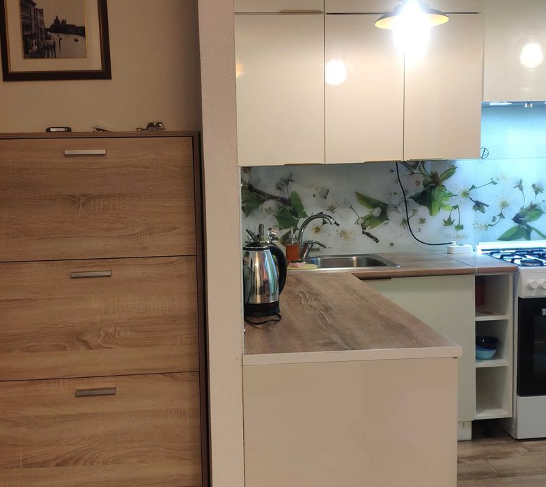 У квартирі продумано все до дрібниць: меблі, техніка, кухня з усім приладдям, холодильник, пральна машина. Балкон додає простору і комфорту з диваньчиком. Зроблено ремонт, підлога з підігрівом, автономне опалення, батарея, душова кабіна. Є можливість поставити власну машину біля будинку.