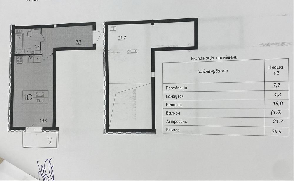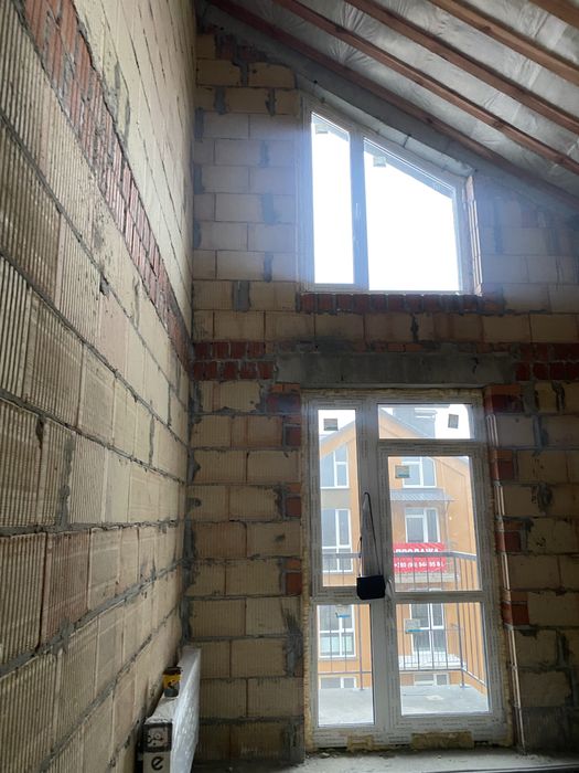 Площа квартири – 54,5 м². Перший поверх – 31,8 м² (+3,4 балкон), другий – 21,7 м². Є можливість розширення другого поверху від стіни до стіни зі збільшенням загальної площі квартири на 10+ м². Будинок класу Комфорт, ліфти – Schindler, дах добре утеплений, можна врізати додаткове вікно у скатному даху кімнати на другому рівні.