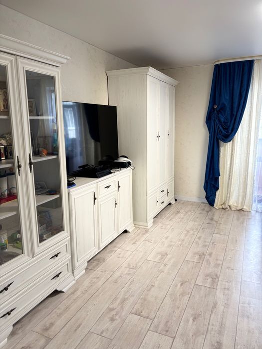 У кімнаті розкладний диван і меблева стінка, тюль і штори. Вихід на лоджію, де проведена електрика і є розетка .