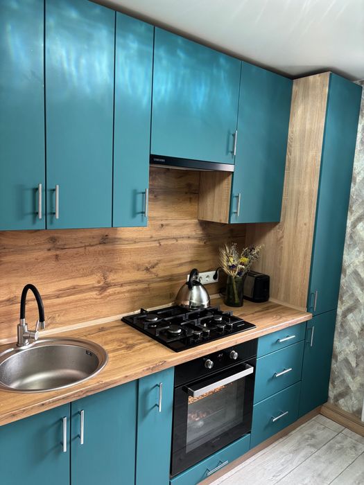 Вбудовані кухонні меблі, варильна поверхня, духова шафа, витяжка, холодильник, мікрохвильова піч. Обідній стіл, стільці.