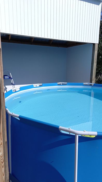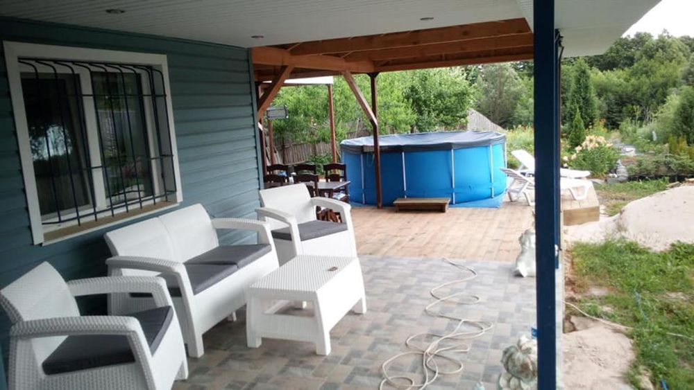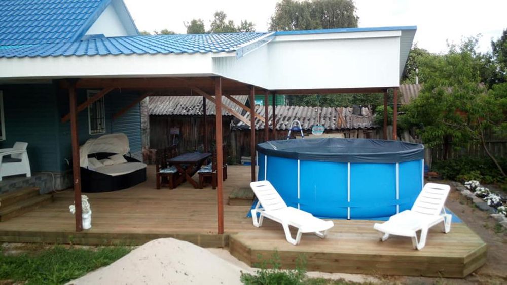 Каркасний басейн, пристрій для фільтрації, для швидкого нагріву води, драбина, інструменти для обслуговування. Шезлонги, парасоля.
