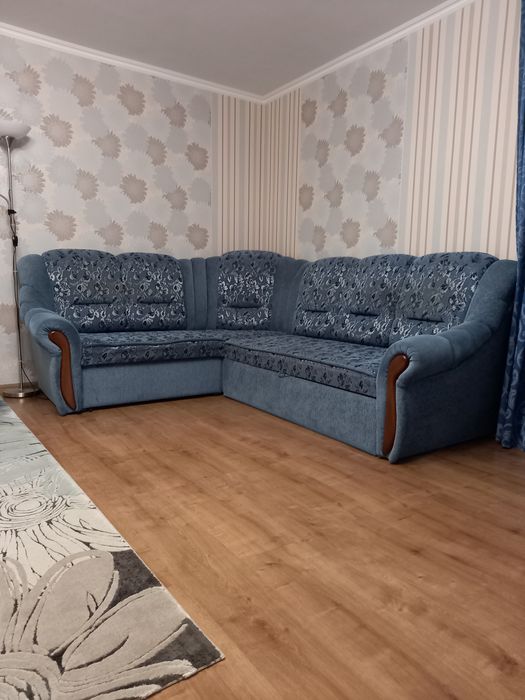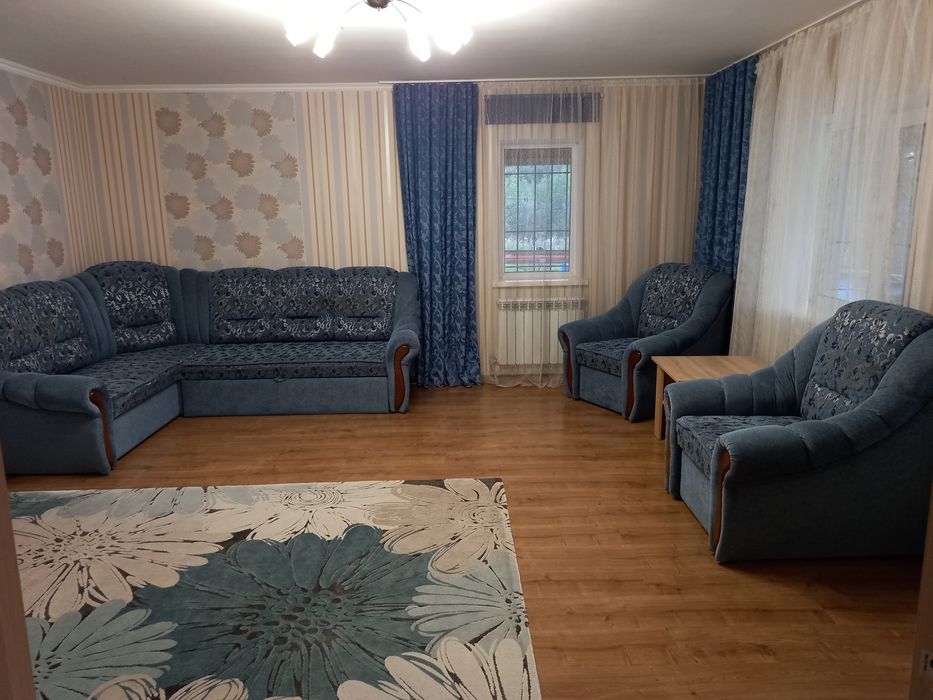 Диван, кутовий диван, 2 крісла, скляний стол з шкіряними стільцями, стол- книжка(як же без нього на свята!), журнальний столик, стійка-бра, величезний килим, три комоди.
