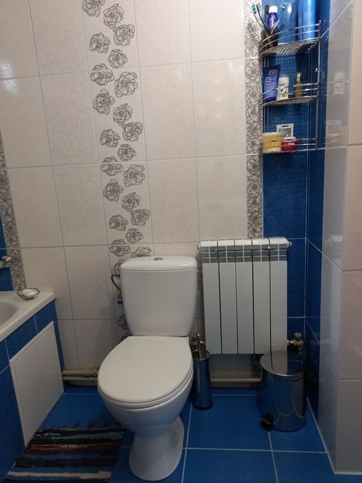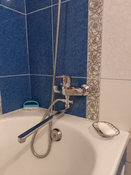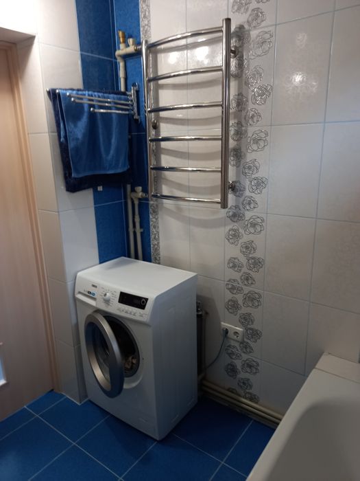 Ванна кімната : акрилова ванна, сантехніка( Італія), стіни під сучасною плиткою, нова пральна машина, тримач для рушників, полка для гігієни та догляду.