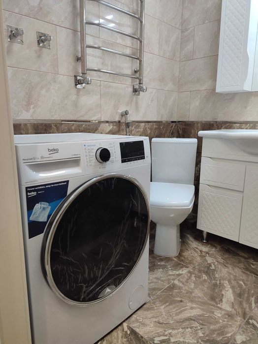 16. В ванній кімнаті встановлена прально-сушильна машина Beko, водяна сушарка для рушників.