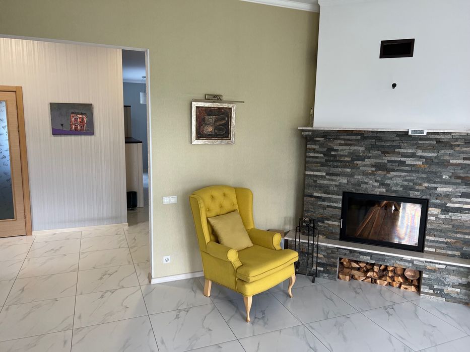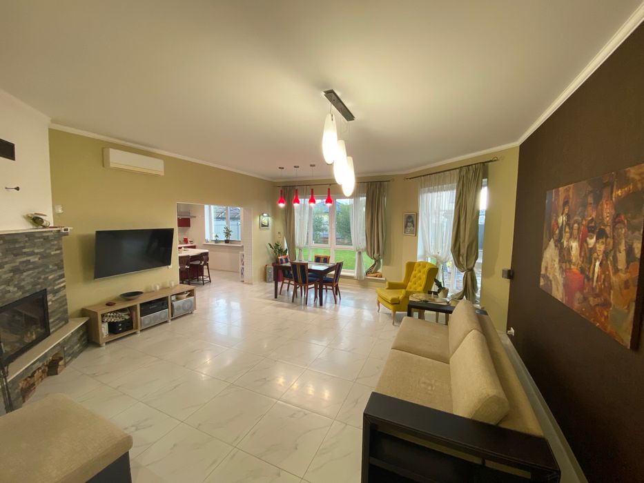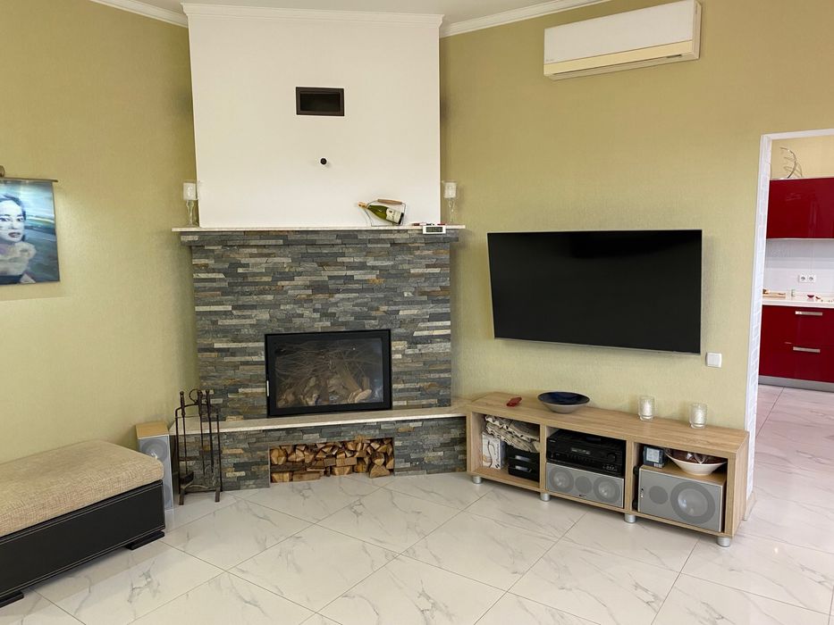 В доме четыре комнаты: три жилые комнаты площадью 18 м2, 15 м2, 15 м2 и гостиная 33 м2. Кухня 16 м2 примыкает к гостиной. Два санузла. Гостиная и кухня имеют большие окна с расположением на юг, поэтому очень светлые и теплые. Остальные три комнаты выходят на восток. Просторный коридор выходит на террасу заднего двора. Высота потолков 3 метра. Камин. Кондиционер Daikin.