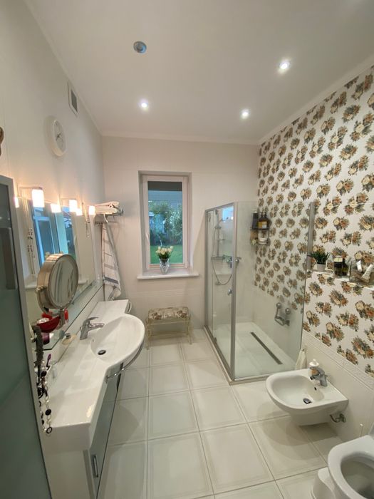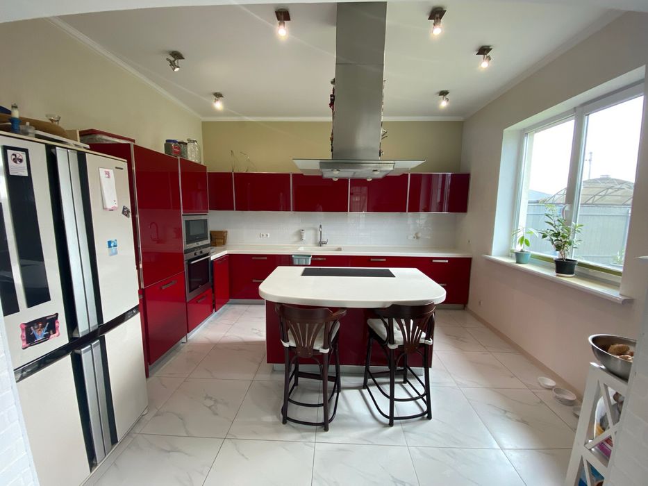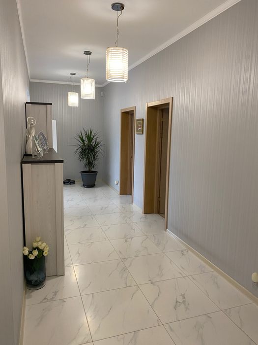 Общая площадь 223м2. Дом одноэтажной постройки имеет террасную входную группу площадью 9 м2, террасу заднего двора площадью 18 м2, общая площадь внутренней части дома составляет 184 м2 из которых 40 м2 это комнаты второго уровня, которые используются, как дополнительная гардеробная, кладовка. Так же на втором уровне расположена система очистки воды, напольный бойлер 250 л., ввод центрального кабеля оптической линии интернета и распределения интернет кабеля по комнатам (роутер), место установки сигнализации и блока видеонаблюдения.
