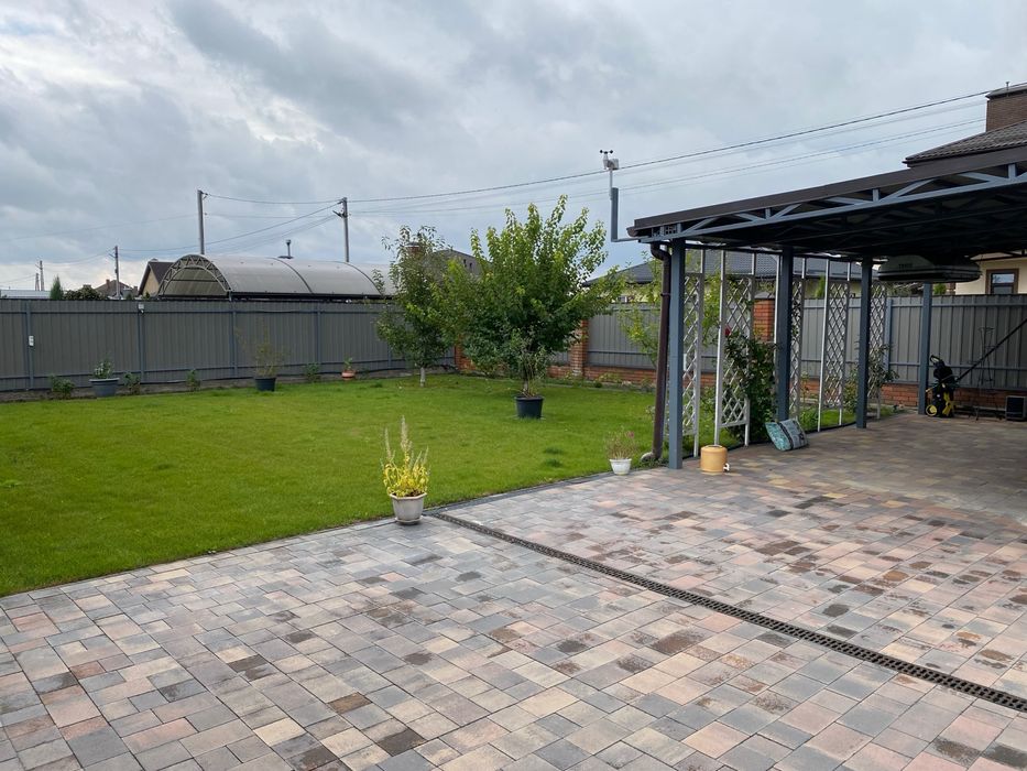 На участке расположены следующие постройки: навес для машины, жилой дом, хозяйственный дом. Дорожки на участке, периметр дома, въездная группа уложена тротуарной плиткой. Остальной участок газонная трава с автоматическим поливом. Десять фруктовых деревьев, а так же кусты смородины и малины. Так же изготовлены “теплые грядки” для выращивания овощей с автоматическим капельным поливом.
