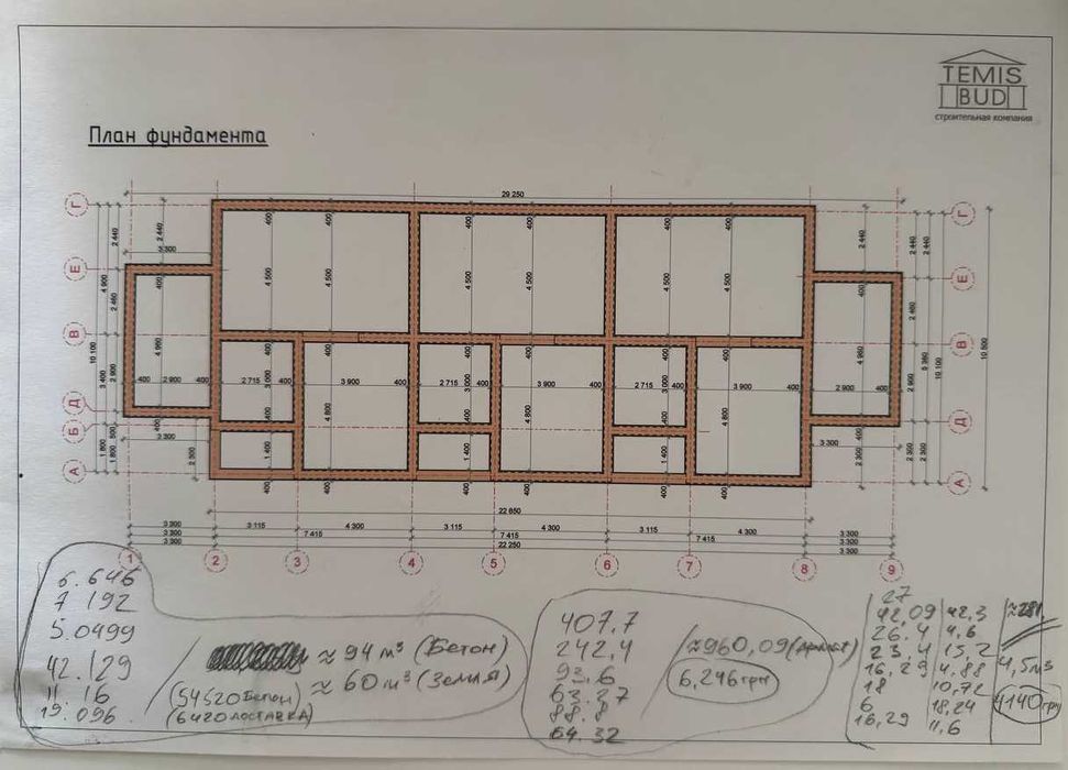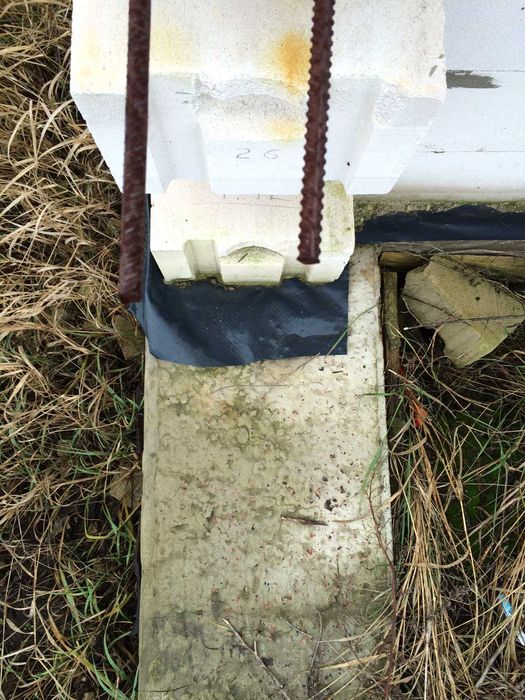 Залізобетонний (черв'ячний, посилений) фундамент за планом під корпус будинку на 3 окремих входи. Фундамент залитий армований і підсипаний у внутрішній частині.