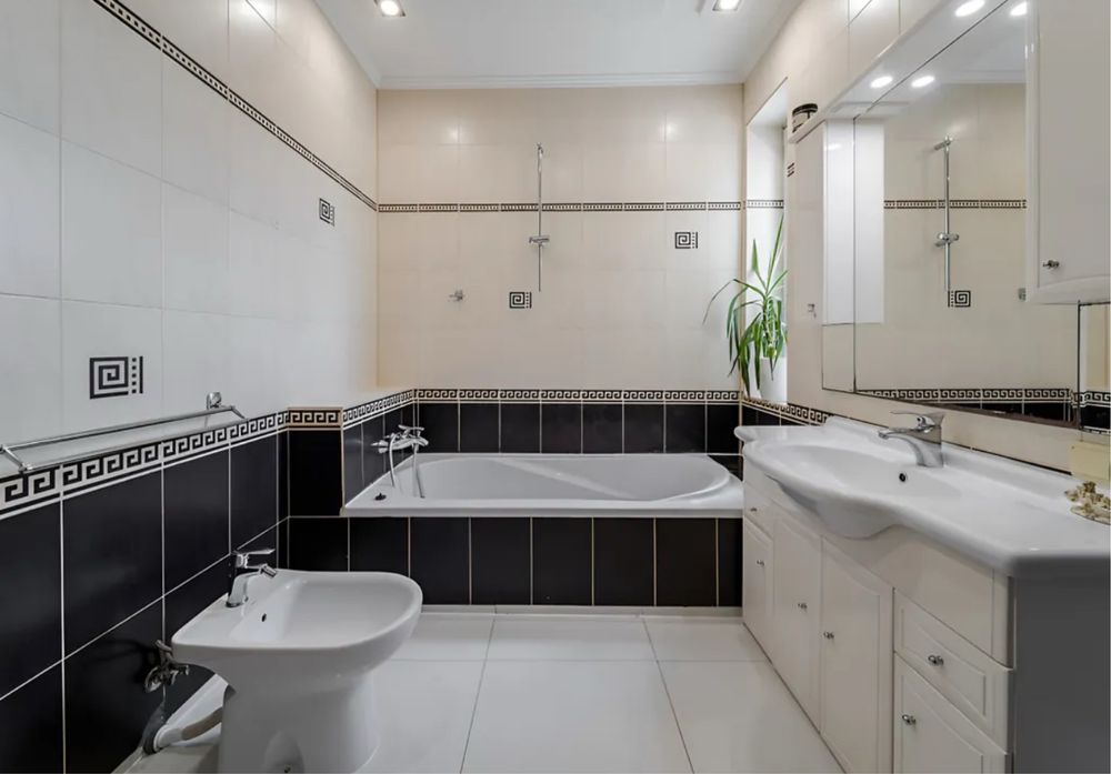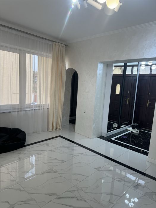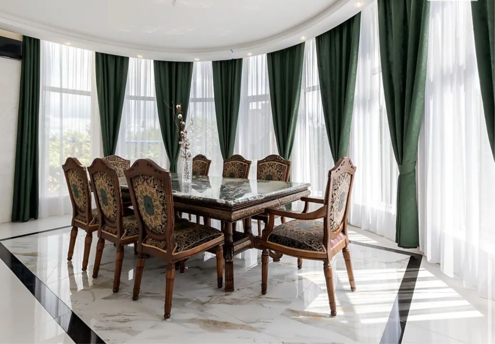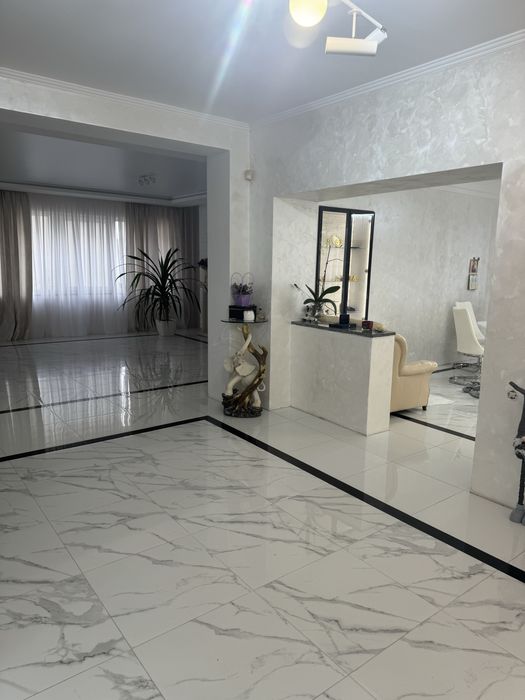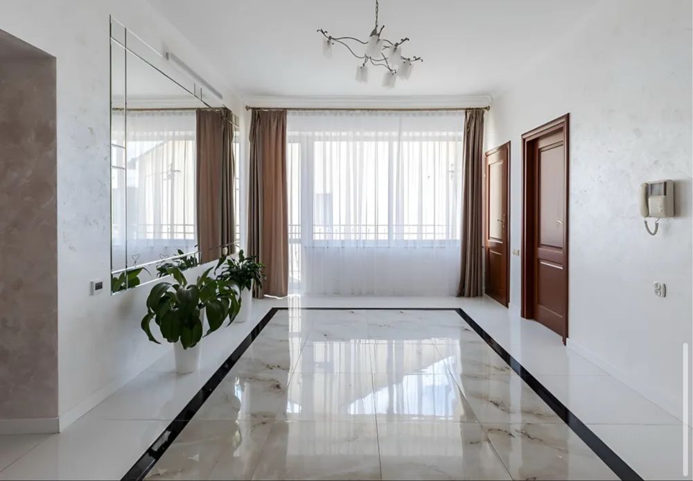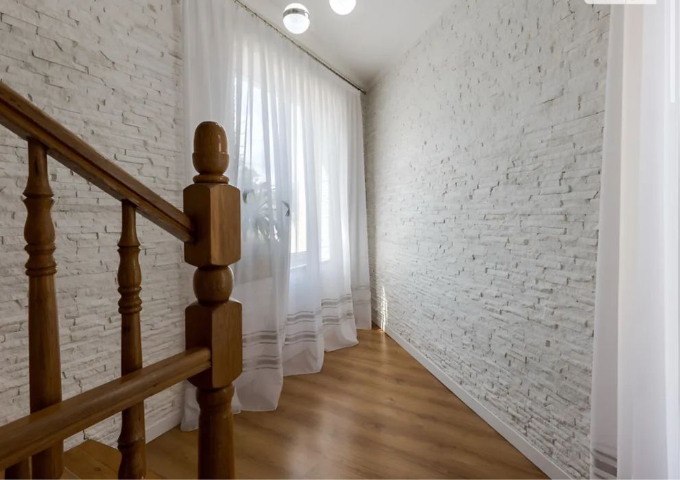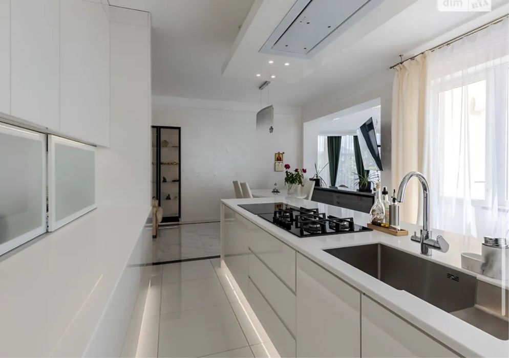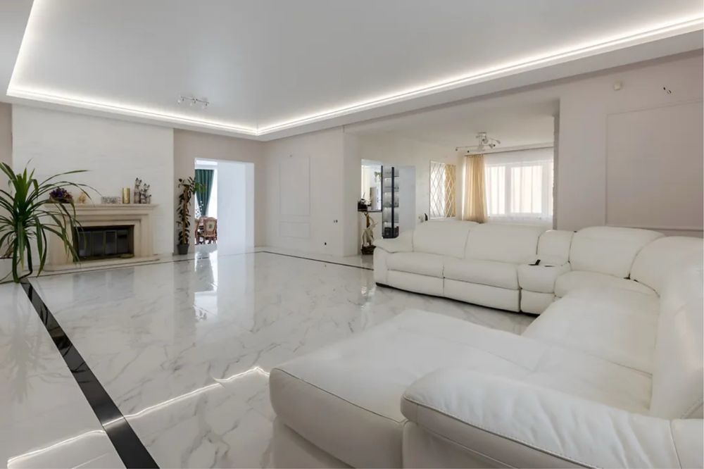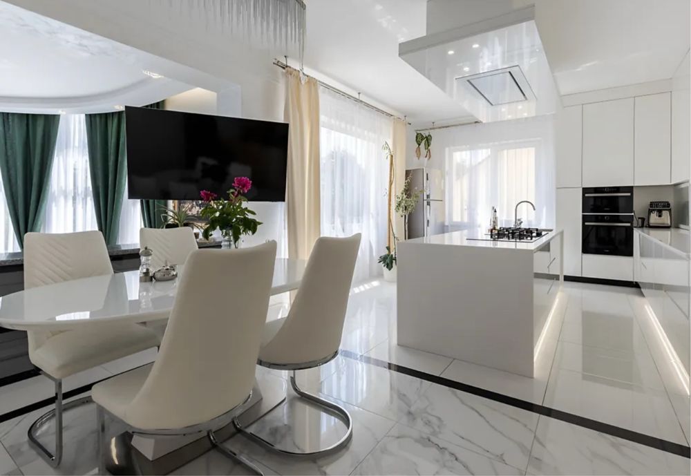 Загальна площа 579, 2 м.кв., житлова 217, 3 м.кв., кухня 32.6 м.кв. Будинок вирішений в світлих тонах, просторий та затишний. Стіни сходової клітини обличковані білим натуральним Грецьким мармуром Тасос. Кухня сучасна і продумана, є прекрасні потужні витяжки, вся техніка абсолютно нова. В їдальні стоїть вінтажний стіл зі стільницею з італійського зеленого мармуру.