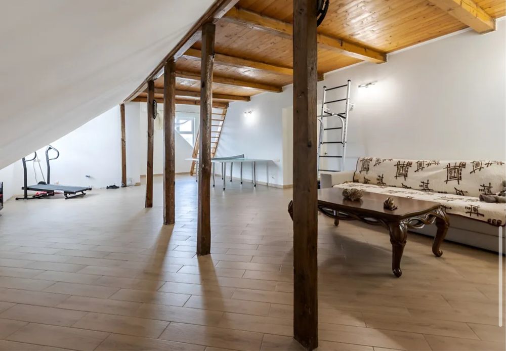 На мансардному рівні спортивно - відпочинкова зона, санвузол, спальня і виходи на горище, яке використовується для зберігання речей.