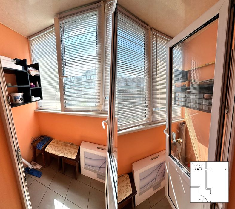 Балком на всю ширину квартири, частина напроти кухні залишена як балкон, частина оздоблена як продовження кімнати. Вікна високі, в квартирі дуже світло. Окрім жалюзів є карнизи, можна повісити штори.