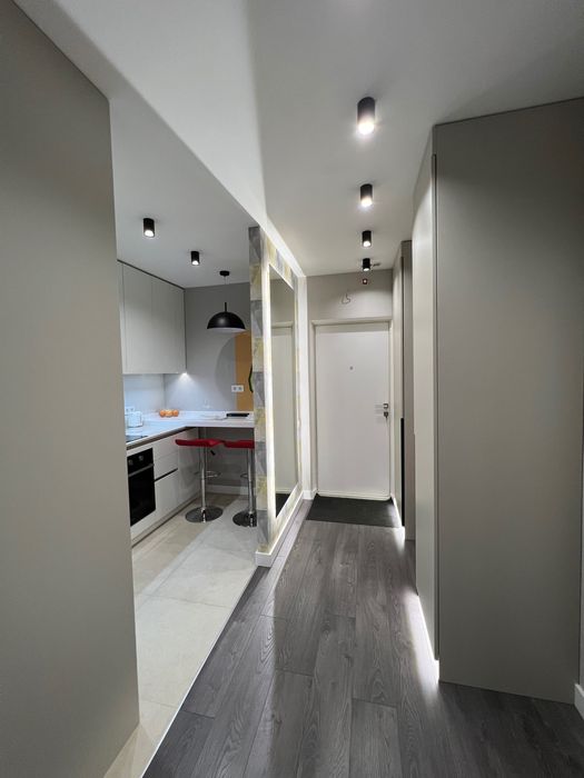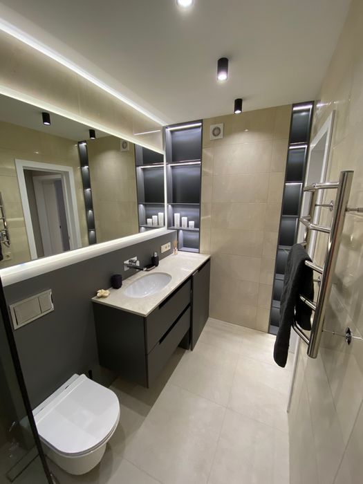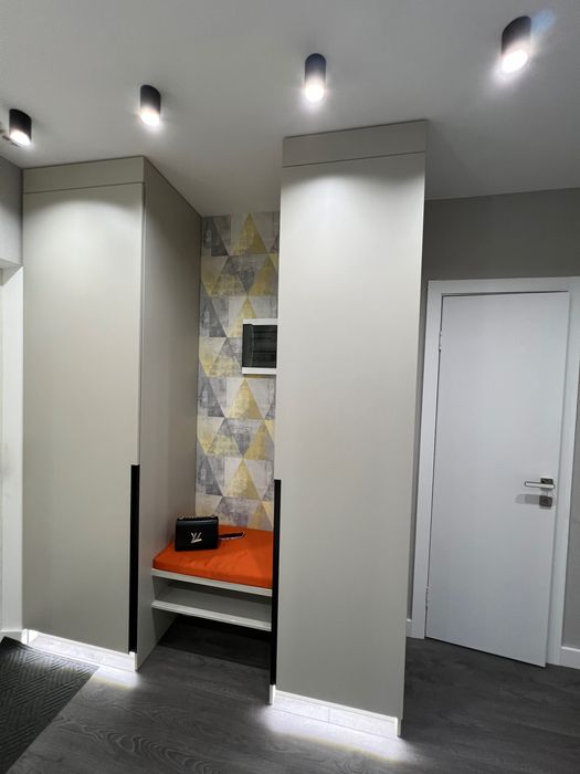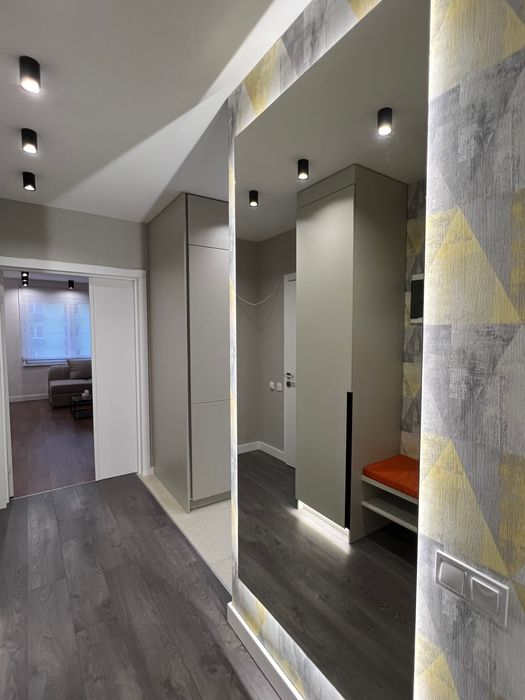 В СУ огромное зеркало с подсветкой, подсветка лэд над столешницей в кухне, при входе огромное зеркало с лэд подсветкой, также с подсветкой шкафы в прихожей.