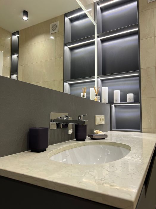Столешница, фартук на кухне и подоконник из кварцита. Инсталляция в СУ из керамогранита, столешница и душевой поддон со стойкой - мрамор.