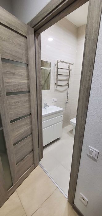 У ванній вся нова сантехніка: душова кабіна, умивальник, пральна машина, рушник-сушитель, шафки, унітаз, бойлер.