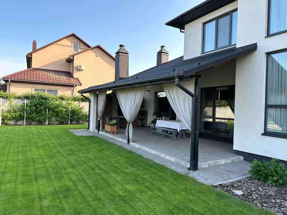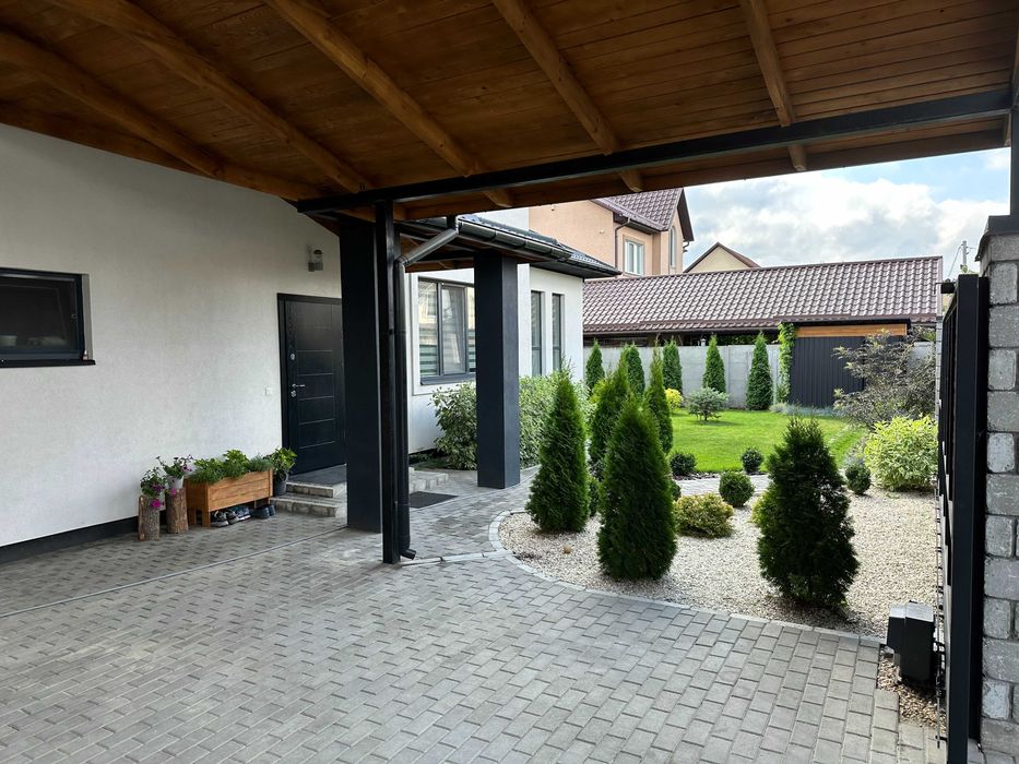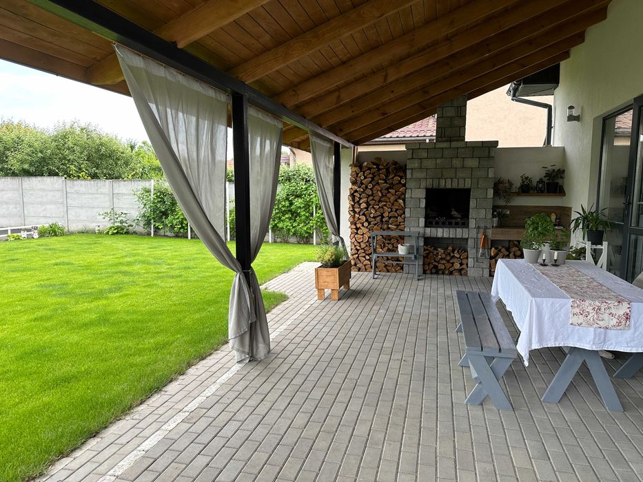 • Закритий навіс для двох великих автомобілів з просторим хоз.приміщенням. Доглянута ділянка, велика тіньова терраса з кам’яним мангалом та міні-кухнею.