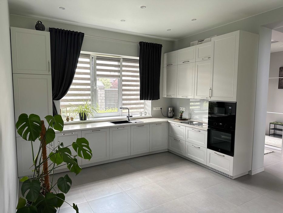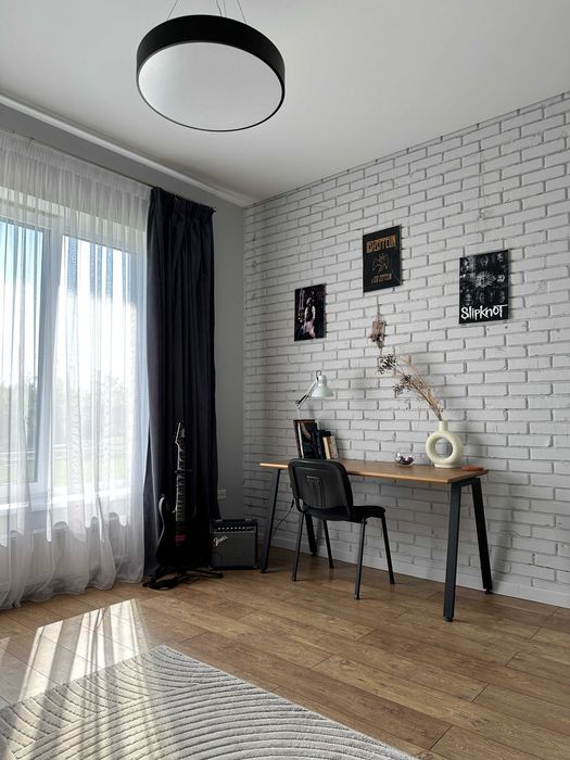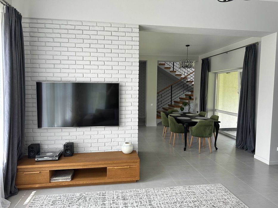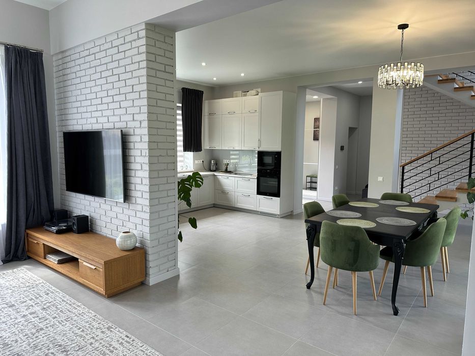 1-й поверх- простора кухня-вітальня в стилі Open Space : кухонна фурнітура від фірми BLUM, уся техніка (посудомийка, мікрохвильова, холодильник тощо) вбудована. Гостьовий санвузол, кабінет, передпокій з місцем для зберігання речей, котєльна.