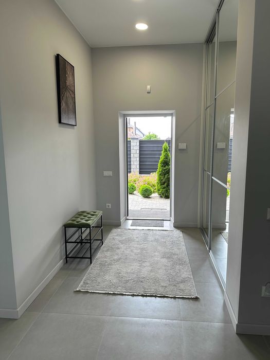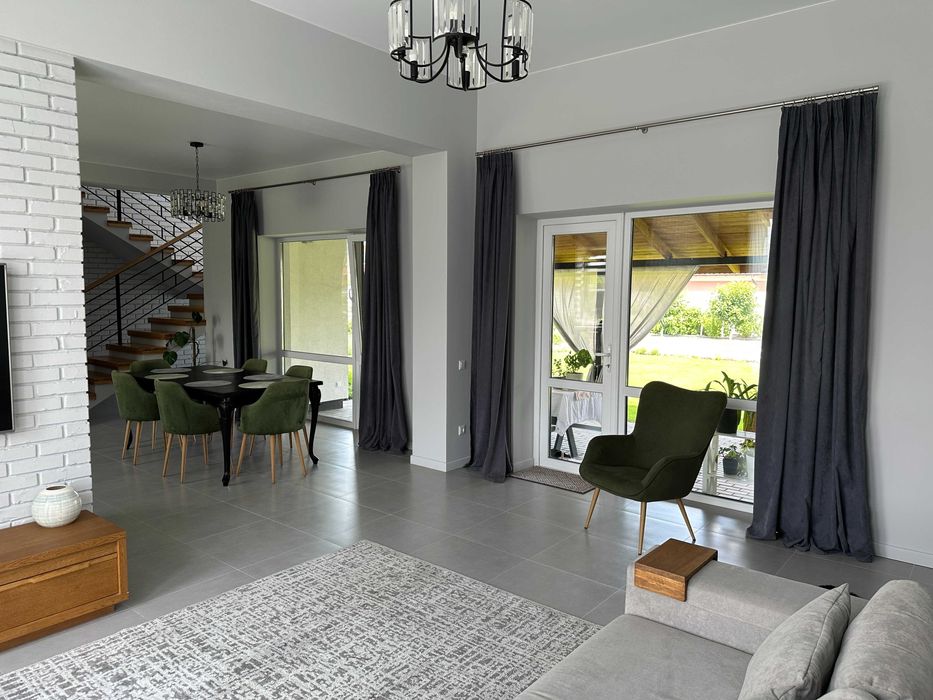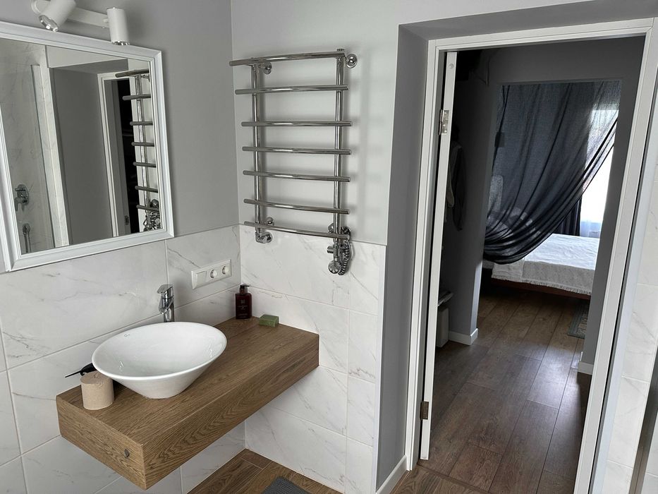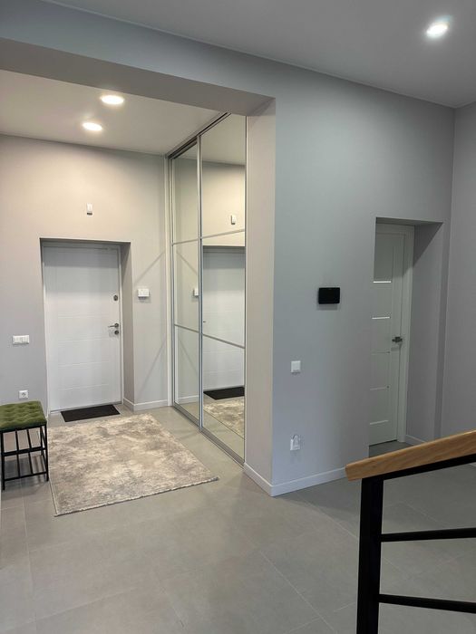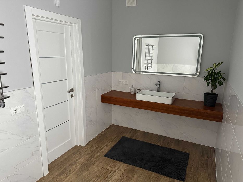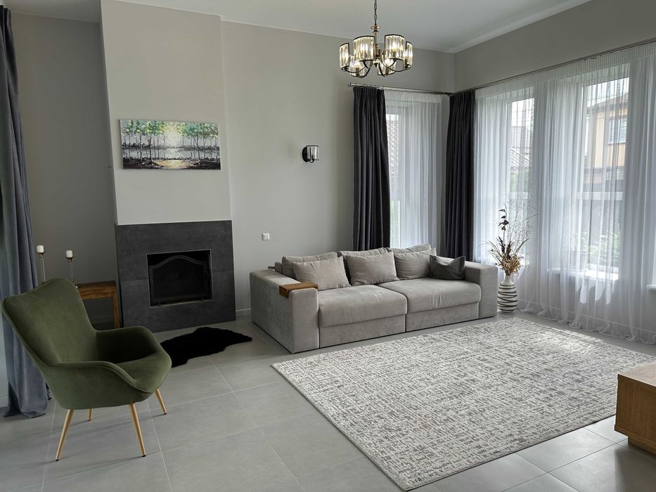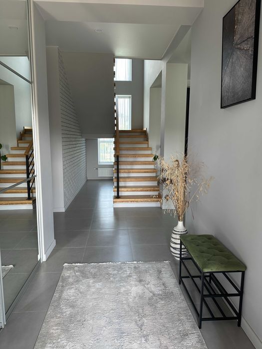 Архітектурно продумане зонування (робоча зона, лаунж зона, зона каміну, вихід на терасу та внутрішній двір). Весть перший поверх та санвузли – тепла підлога. На другий поверх ведуть дизайнерські дерев’яні сходи на монолітному каркасі.