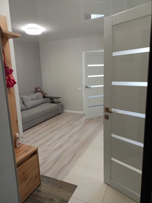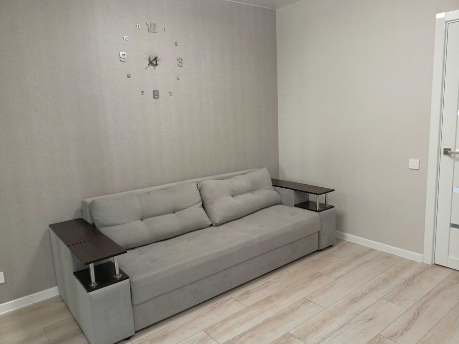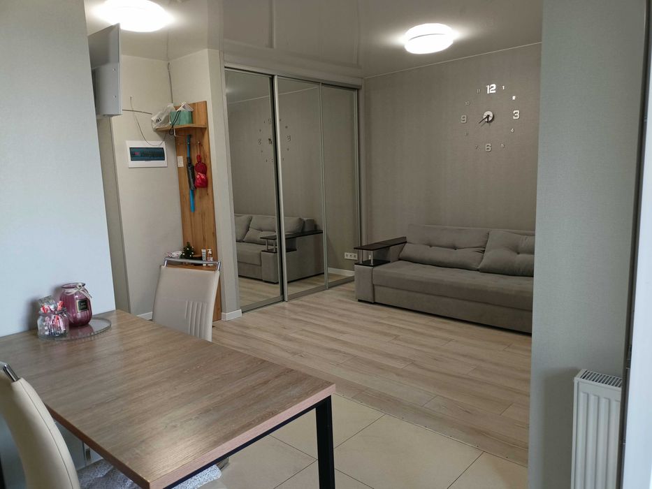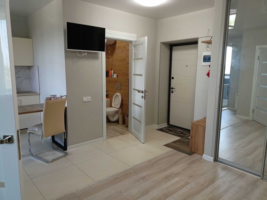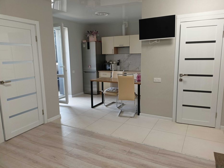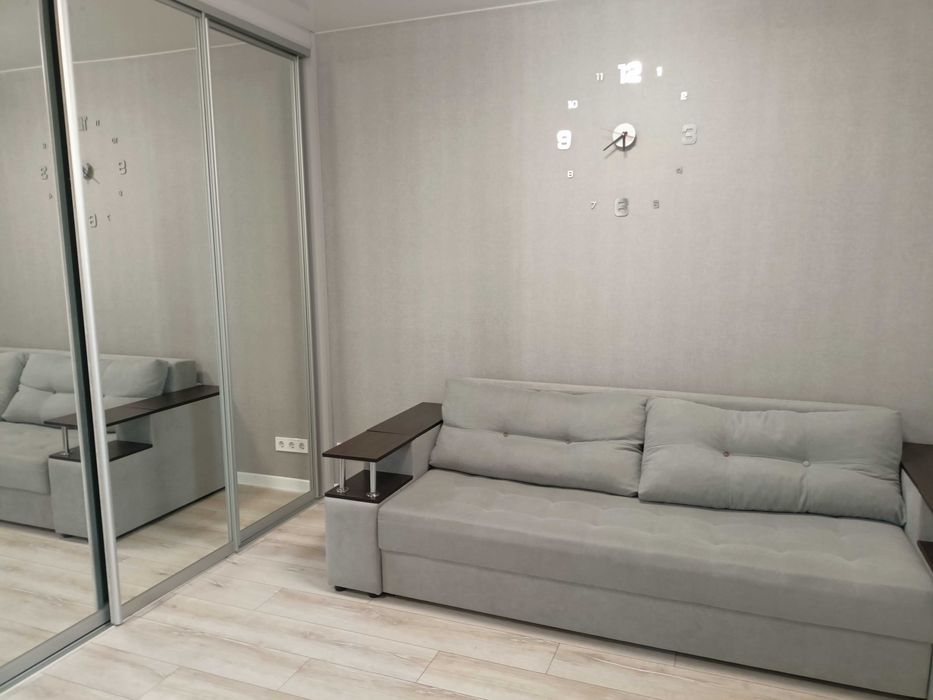 Квартира обладнана всім необхідним меблями та технікою. Планування квартири - "євро-двушка", є балкон. На території будинку передбачено гостьову парковку та дитячий майданчик.