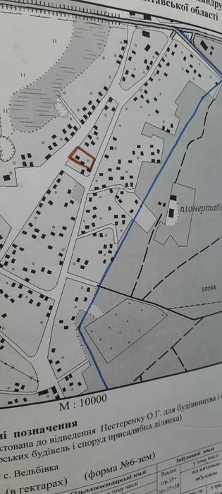 Ділянка під забудову 0,21 га с. Вельбівка; Земельна ділянка під забудову в мальовничому селі Вельбівка, Миргогодського (Гадяцького) р-ну, поряд з ДОТ "Горизонт". Під'їзд з двох сторін, з однії сторони бетонний забор, з інших двох огорожа з металопрофіля. Залитий фундамент під будинок 10×10. Поряд продуктовий магазин, зупинка громадського транспорту, сосновий ліс, річка Псел, відстань до міста 3 км. В селі є дитячий садок, школа, також можливість під'їзду шкільним автобусом до школи у місті. Пісчаний грунт. Можливість обміну на авто вартістю не менше 5000 дол. США.