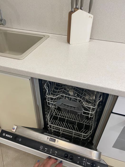 Кухня студія з посудомийкою, вбудованим холодильником, духовкою, фільтром для питної води . Є дуже комфортний кутовий диван.