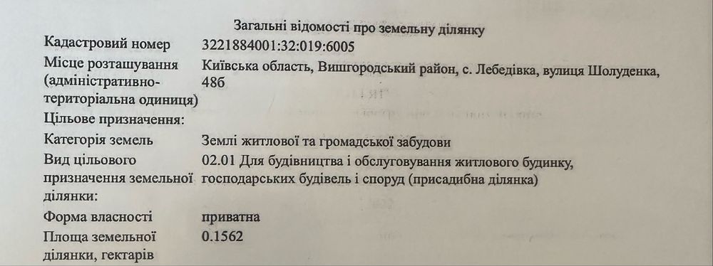 Лебедівка, квадратна ділянка, пішки 8 хв від каналу, під забудову; Кадастровий номер: 3221884001:32:019:6005, адреса ділянки: с. Лебедівка, вул. Шолуденка, 48Б. Найгарніша частина села, що забудовується новими сучасними мальовничими будинками. До каналу з лісом 600 м, або 8 хв пішки. Сусідські будинки на гарній відстані, що дає відчуття тиші і спокою. Рівна правильної форми ділянка 15,62 сотки. Фасадна частина 30,3 м. З двох сторін від сусідів є паркан. Світло на ділянці є, газ поруч. Цільове призначення ділянки код 02.01 «Для будівництва і обслуговування житлового будинку, господарських будівель і споруд (присадибна ділянка)». Ціна 2000 $ за сотку. Торг можливий. Я власниця. Можу вислати відео і геолокацію. На останньому фото червоним позначена ділянка.