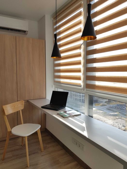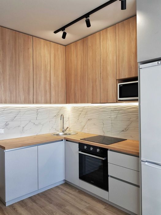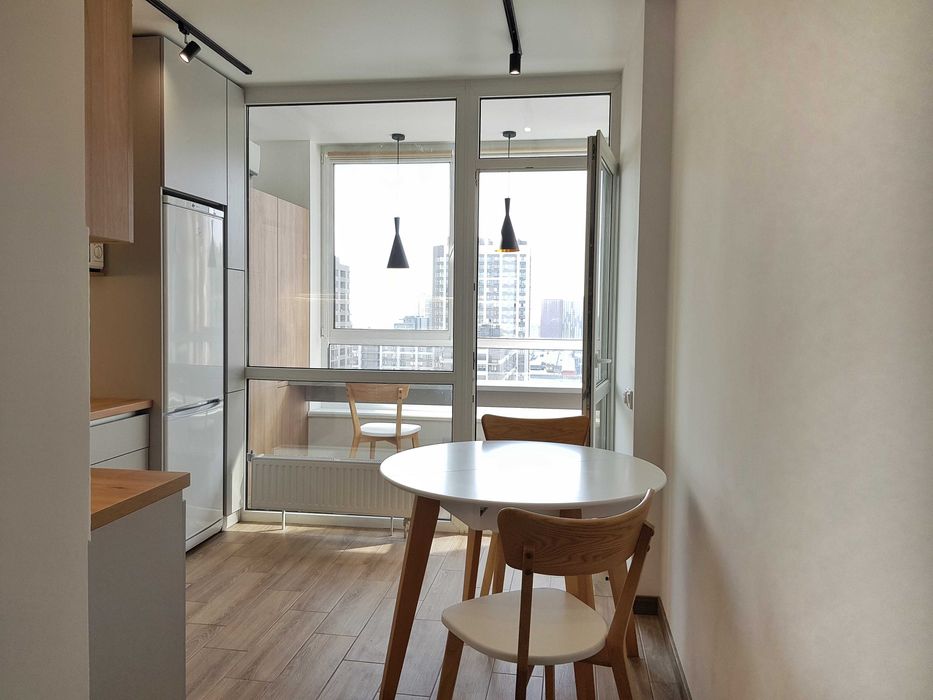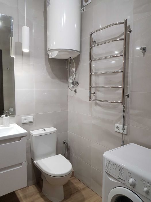 Квартира укомплектована всіма меблями та технікою (холодильник, мікрохвильова піч, духова шафа, варильна поверхня, кондиціонер, підігрів підлоги, бойлер, пральна машина, пилосос, чайник, гладильна дошка, телевізор, система антипотоп).