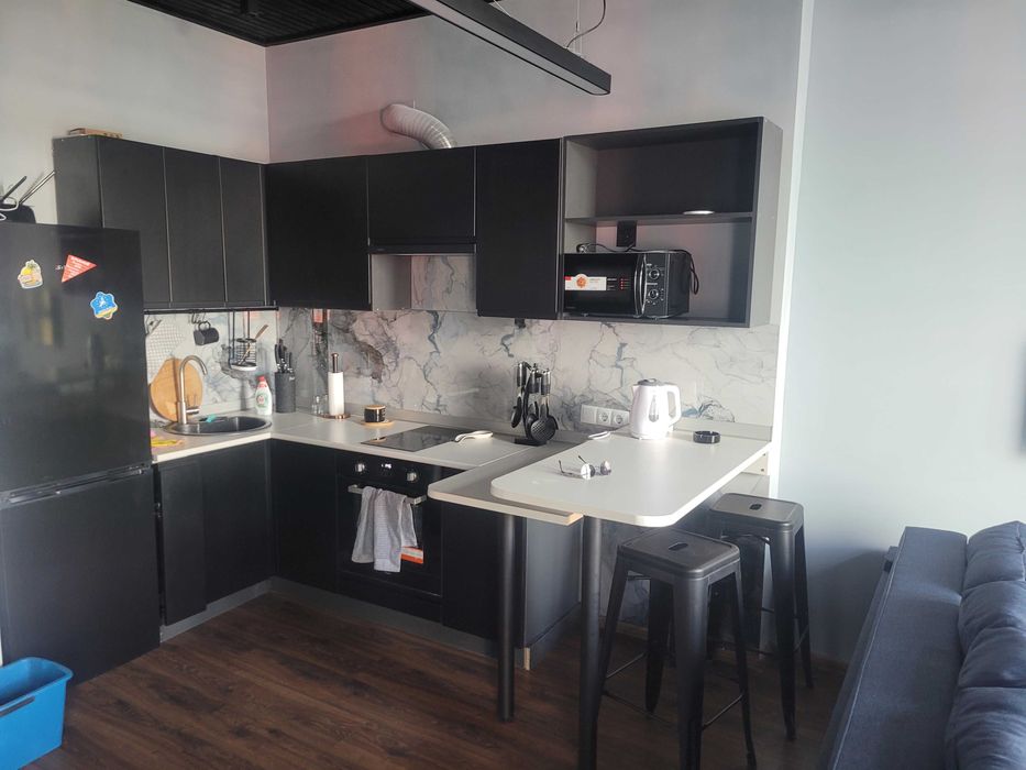 - Полноценная просторная кухня, со всей техникой - вытяжка, духовка, электрическая плита, микроволновка и холодильник, полный набор посуды, аксессуаров, всего, что может понадобится. Барная стойка со стульями.