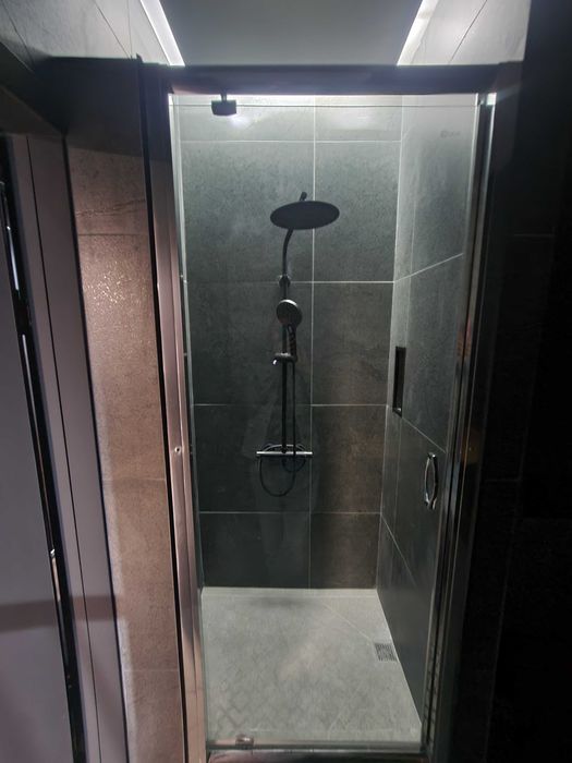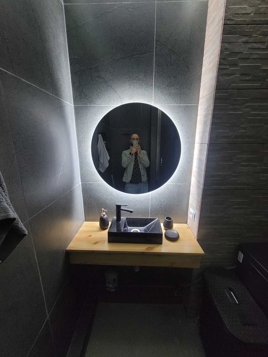 - В ванной зеркало с подсветкой, полотенцесушитель, стиралка, стул для генерации творческих идей, корзина для белья и просторная душевая. Подсветка выполнена таким образом, что есть режим минимального света, если надо сранья идти в душ, а полный режим оставляет пространство слегка приглушенным.