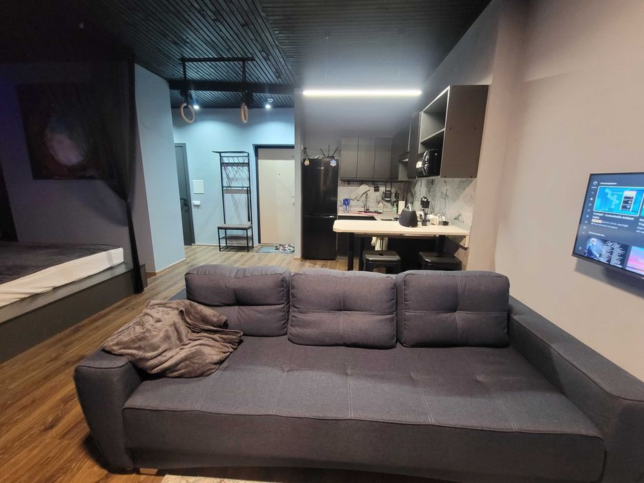 - Само пространство комнаты студии разбито визуально на 2 мини секции, спальня и минигостинная: есть складной диван с пледом и шикарным видом на Одессу, еврокнижка, в разложенном состоянии размеры спального места 160х200см. Есть журнальный столик, lcd-телевизор 36'. Кондиционер работает как на тепло, так и на холод. Ты наверняка любишь смотреть фильмы, и поэтому для тебя тут есть проектор с огромным экраном. Можно с ноута вывести по вайфаю туда картинку и кафовать. Возможно ты аллергик или просто любишь чистый воздух - для тебя тут есть очиститель воздуха с ионизацией.