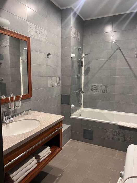 В двокімнатній квартирі є все необхідне для проживання (посудомийна машина, пральна машина, невеликий холодильник з морозильною камерою, мікрохвильовка, варильна поверхня на 2 конфорки, телевізор, кондиціонер, двоспальне ліжко, шафа-купе, барна стійка зі стільцями, розкладний великий диван; немає духової шафи на кухні). Ванна кімната з бойлером на 50 л.