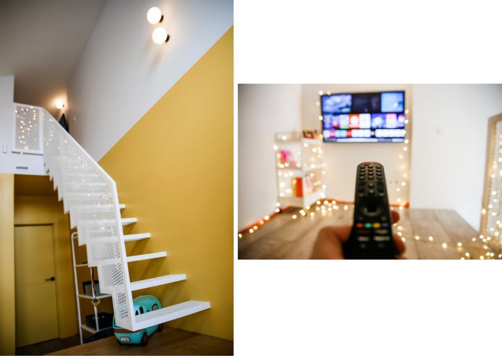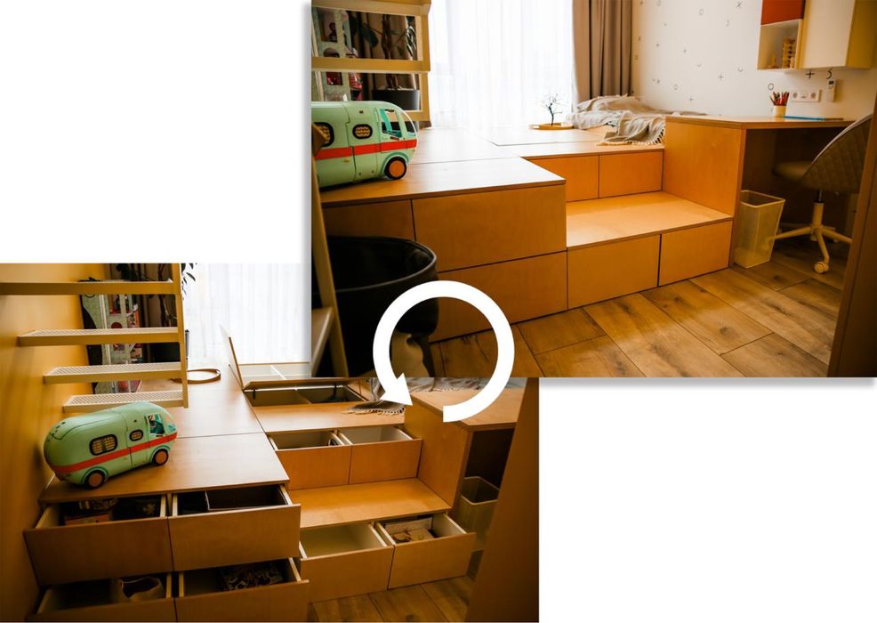 Дитяча - простора креативна кімната з функціональними подіумами, в яких вбудовані місця для зберігання. Всі меблі вбудовані і дуже зручні. Велика дитяча шафа, місце для навчання. Сходи на другий поверх, де ігрова з телевізором LG 4k. Дитина буде у захваті!