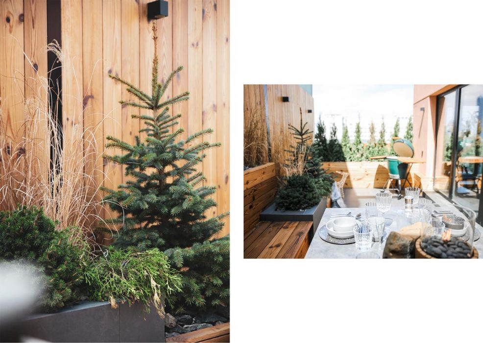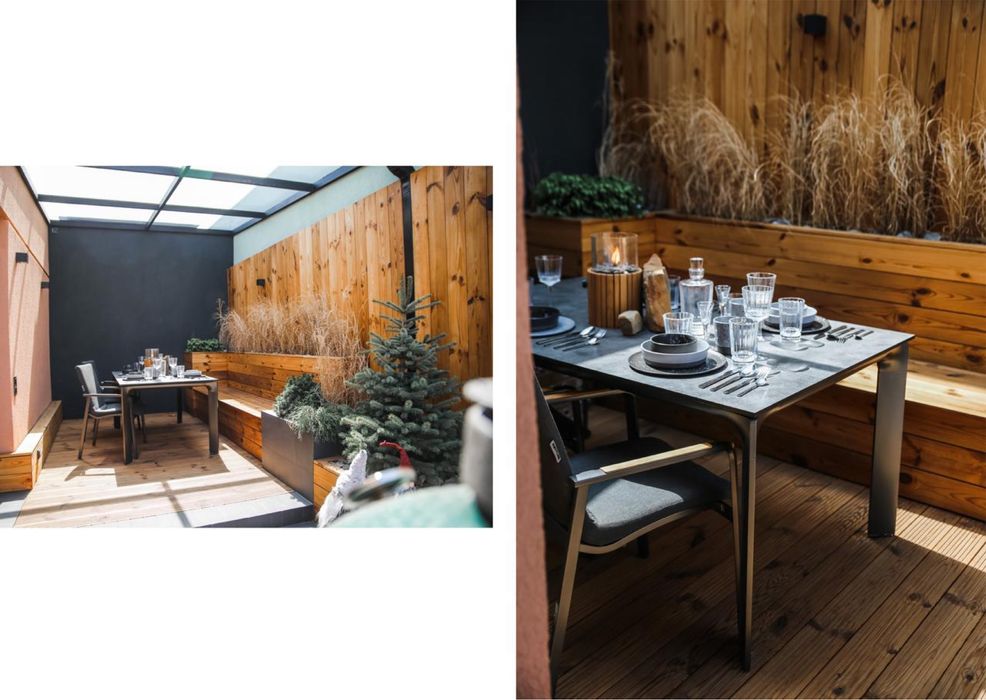 Простора тераса 17 м2, яку ми озеленили дорослими деревами. Тераса обшита спеціальною термососною стійкою до вигоряння, під керамо-гранітовою плиткою закладена сніготайка. Накрита тераса надійним металевим каркасом та триплес подвійним склом, все дуже надійно. Розведені розетки, прохідні вимикачі та налагоджено освітлення. Спеціалізовані вуличні меблі - стіл і два стільці Kettler Germany, Новорічний олень і парочка санта клаусів з гномами для підняття новорічного настрою )